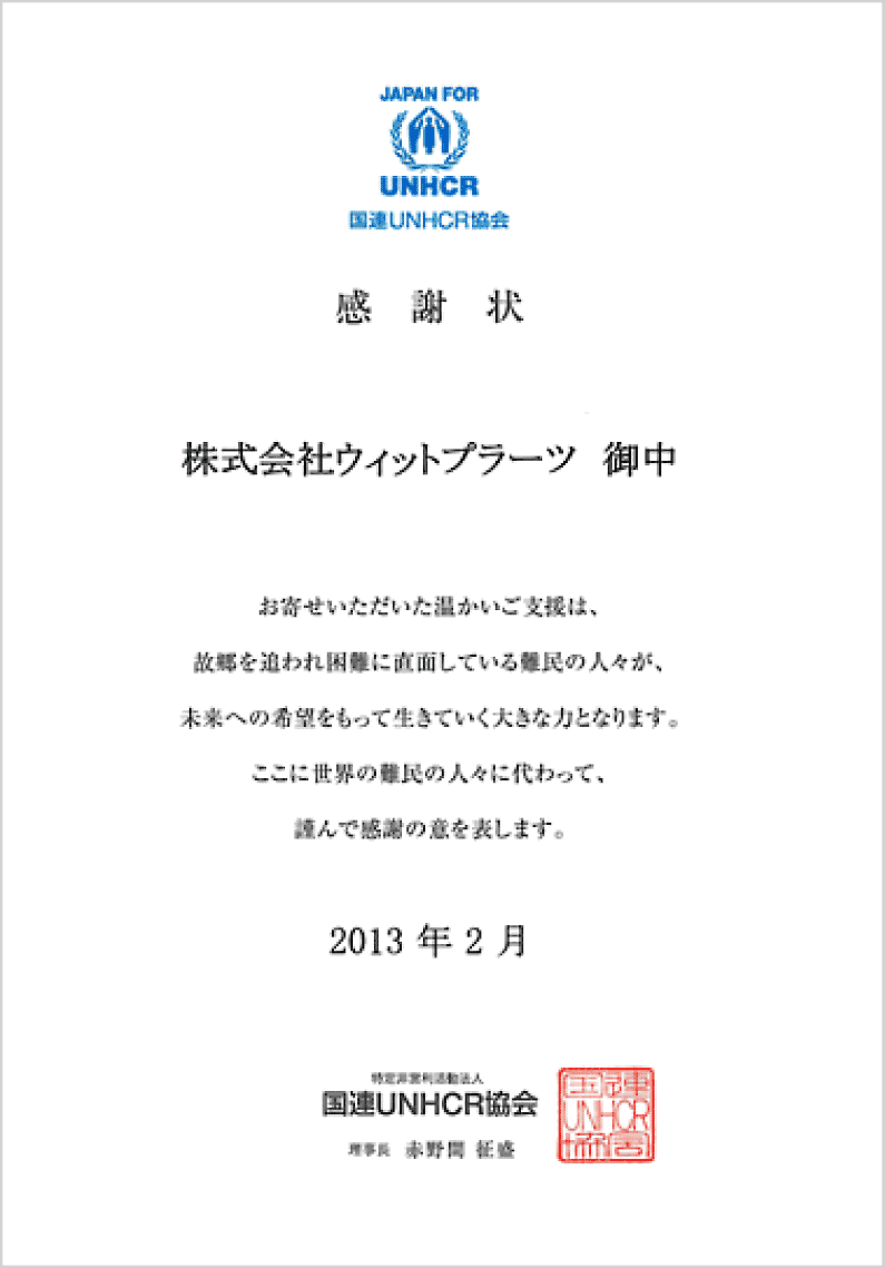ケニア政府の不安定な状況時に、スラム街の撤去から家が5000戸取り壊され、家族15000人以上がバラバラに住むことになりました。支援要請があり、我々ができることとして、特別支援をしました。その国連UNHCR協会から感謝状を受けました。国連UNHCR協会とは、国連の難民支援機関UNHCRの活動を支える日本の公式支援窓口です。